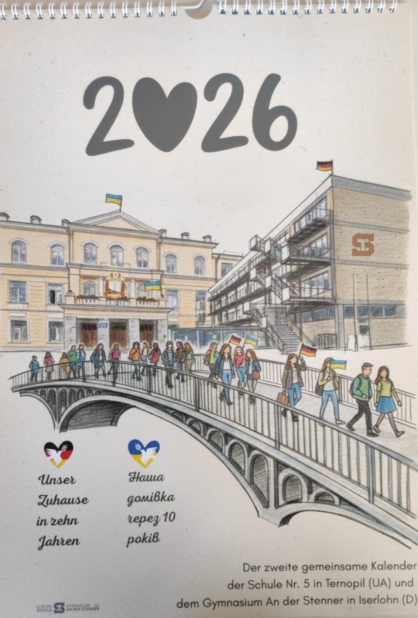 Im Rahmen unseres Leuchtturmprojekts haben wir eine spannende und kreative Zusammenarbeit mit unserer Partnerschule, der "Schule Nr. 5" aus Ternopil, initiiert. Dieses Projekt zielt darauf ab, den interkulturellen Austausch zu fördern und die Kreativität unserer Schülerinnen und Schüler zu stärken. Für das Jahr 2026 haben wir einen Kalender mit dem Thema "Mein Zuhause in 10 Jahren" gestaltet. Die Schülerinnen und Schüler hatten die Aufgabe, ihre Visionen und Ideen für die Zukunft kreativ zu visualisieren. Dabei wurden verschiedene Aspekte des Lebens in der Zukunft berücksichtigt, wie Architektur und Wohnraumgestaltung, Nachhaltigkeit und Umweltbewusstsein, technologische Entwicklungen sowie soziale Interaktionen und Gemeinschaft. Dieser Kalender ist nicht nur ein Kunstwerk, sondern auch ein Ausdruck der Hoffnungen und Träume junger Menschen in einer sich schnell verändernden Welt. Der erste Kalender 2025, der im Rahmen dieser Zusammenarbeit entstand, hatte das Thema "Demokratie aus Kinderaugen". Hierbei setzten sich die Schülerinnen und Schüler mit den Werten und Prinzipien der Demokratie auseinander. Sie reflektierten, was Demokratie für sie bedeutet und wie sie in ihrem Alltag erlebt wird. Die Übergabe beider Kalender fand in einem feierlichen Rahmen statt, zu den Ehrengästen gehörten wie z.B. der Bürgermeister der Stadt Iserlohn, Michael Joithe, sowie der Bundestagsabgeordnete Paul Ziemiak. Diese Veranstaltung bot eine hervorragende Gelegenheit, die Ergebnisse der kreativen Zusammenarbeit zu würdigen und die Bedeutung von Bildung und interkulturellem Austausch hervorzuheben. Ein wesentlicher Bestandteil des Projekts war der digitale Austausch zwischen den Schülerinnen und Schülern beider Schulen. Durch Online-Plattformen konnten sie Ideen teilen, Feedback geben und gemeinsam an den Entwürfen arbeiten. Dieser Prozess förderte nicht nur die Kreativität, sondern auch die Teamarbeit und Kommunikationsfähigkeiten der Beteiligten. Dank der finanziellen Unterstützung der ENSA, des Entwicklungspolitischen Schulaustauschprogramms, ist in diesem Jahr zudem ein Besuch der ukrainischen Künstler in Iserlohn geplant. Dies wird eine wertvolle Gelegenheit bieten, den kulturellen Austausch weiter zu vertiefen und die Zusammenarbeit zu intensivieren. Wir sind stolz auf die Ergebnisse dieses Leuchtturmprojekts und sehen darin eine wertvolle Möglichkeit, den interkulturellen Dialog zu stärken. Die positiven Rückmeldungen der Schülerinnen und Schüler motivieren uns, auch in Zukunft ähnliche Projekte zu realisieren. Wir freuen uns auf weitere kreative Herausforderungen und darauf, die Zusammenarbeit mit der "Schule Nr. 5" fortzusetzen!